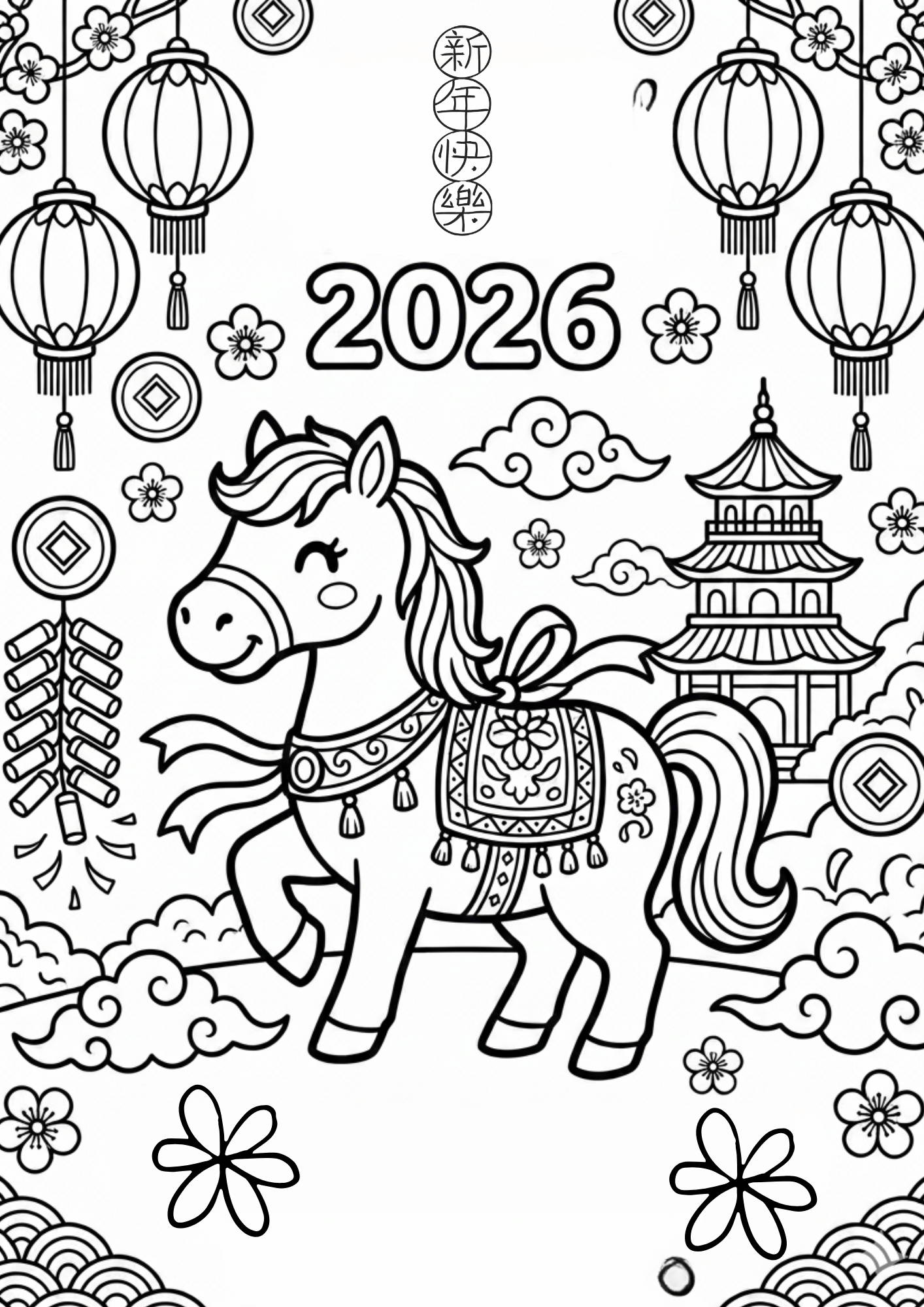 主題: 2026恭賀新禧 - 騎上駿馬,奔向繽紛熱鬧的新春世界!無論是年花市場、舞獅表演、團圓飯桌還是璀璨煙花,都等著你用色彩點亮,創造屬於你的馬年奇幻冒險!
