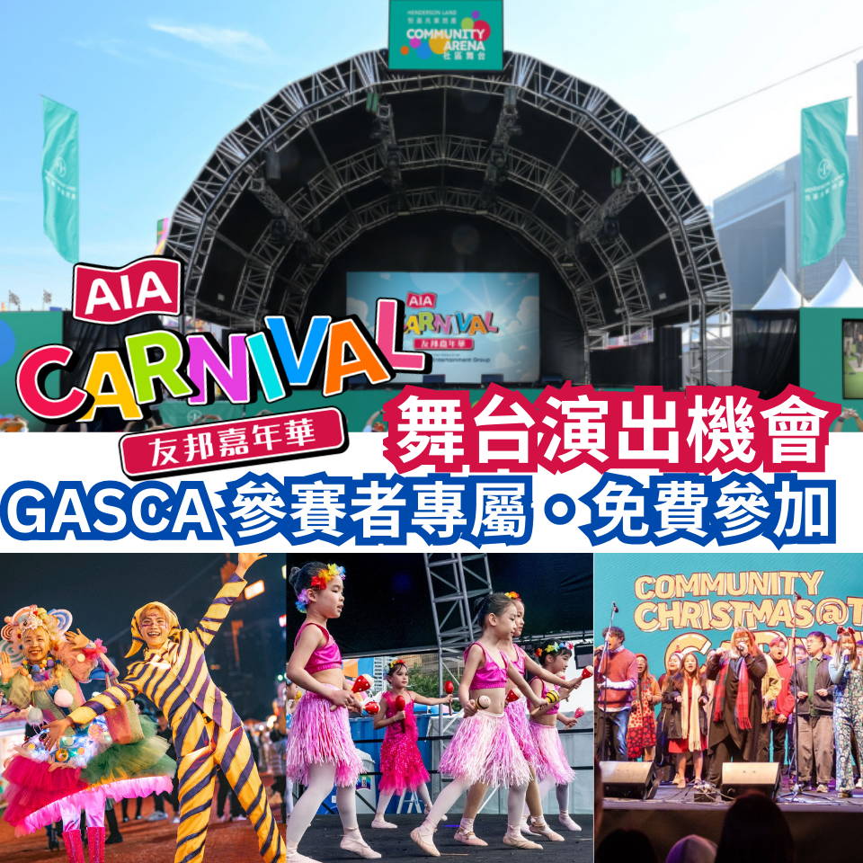 於即日起至 2026年1月15日參加任何GASCA比賽 , 即可獲資格免費申請於香港 AIA Carnival 舞台演出! 名額有限, 先到先得 !